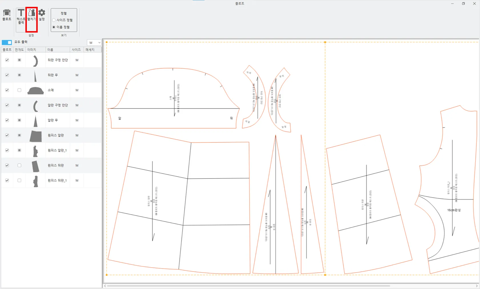 왼쪽의 패턴 정보창에서 원하는 패턴만 선택하면 플로터 용지 크기에 맞게 자동 배치합니다.