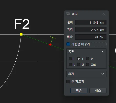 너치를 생성할 선을 선택하거나 선의 끝점을 선택하면 너치 생성창이 뜹니다.