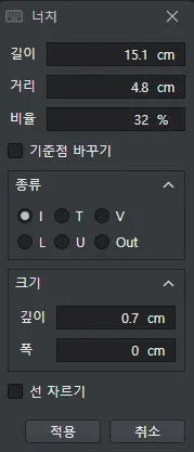 너치의 위치를 입력하고 너치의 종류와 크기를 설정할 수 있습니다.
